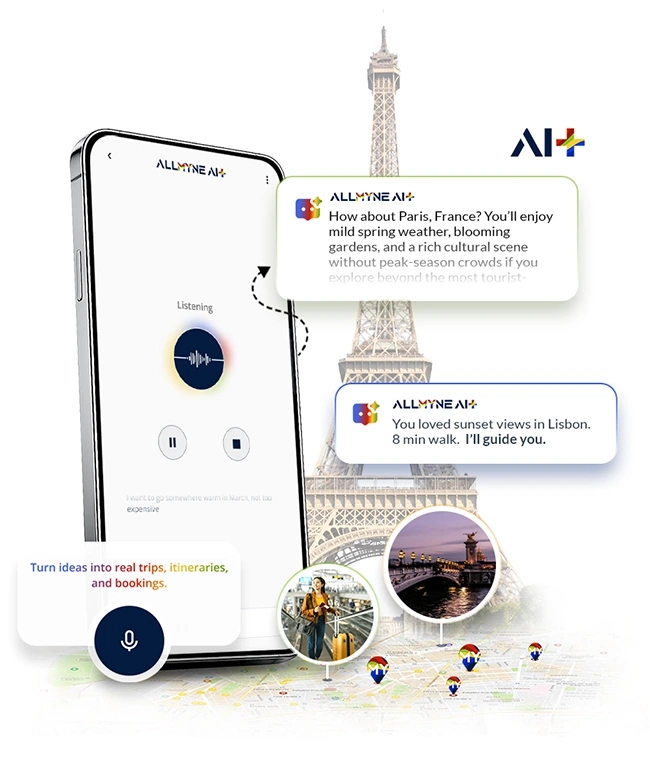 Let next-gen AI+ instantly craft your perfect adventure—discover unique destinations, get personalized recommendations, and explore experiences that match your interests and travel style. From local insights to packing tips, ALLMYNE learns what matters to you and curates every journey around it.