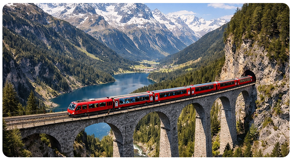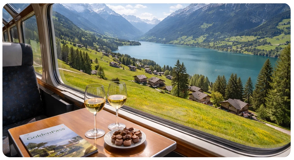 Before we go over some ways to save on your next panoramic train journey through Switzerland, there are three smaller express trains to consider, the first being the Gotthard Panorama Express. Combining a steamboat journey across Lake Lucerne with a route from Lucerne to Lugano, this ride is most attractive for any history buffs in your group. Throughout the experience, you will get to learn about the history of the Gotthard Railway, pass historic locations of Switzerland—like the Rütlie Meadow, where Switzerland was founded—and take in the extravagant sight of the Wassen Church, a Baroque Catholic church, from three different angles.